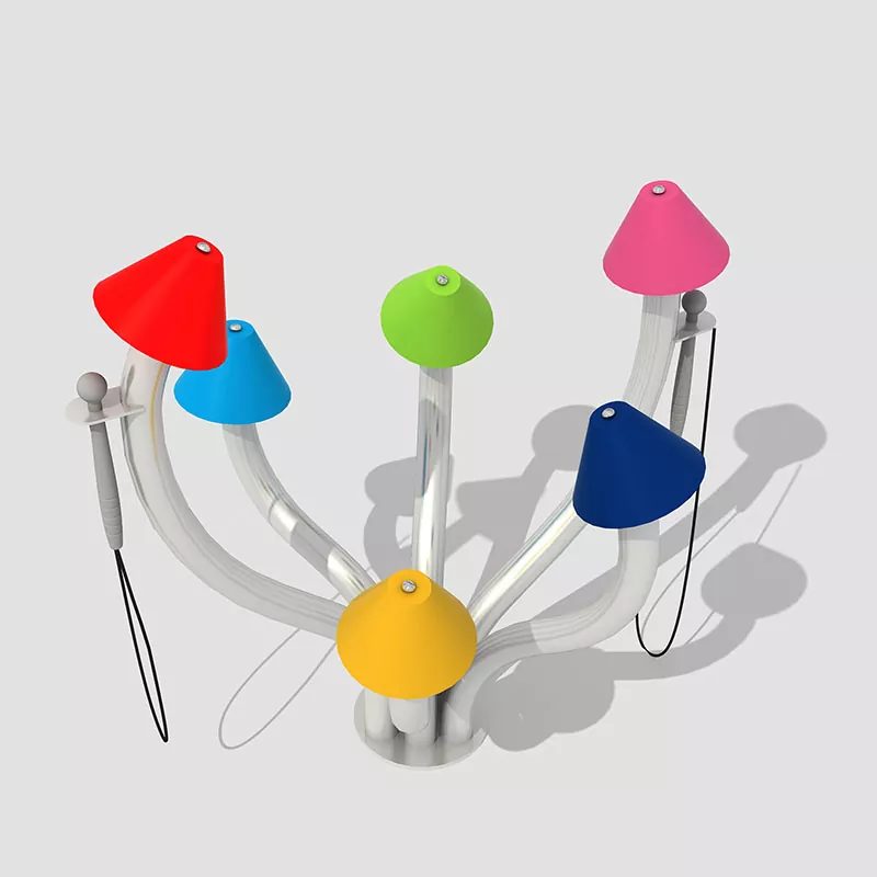 Набор из шести конических «шляп» ярких цветов с порошковым покрытием и гофрированными стержнями из нержавеющей стали, расположенными на разной высоте и под разными углами, что делает его ярким элементом, который вскоре станет самым популярным.